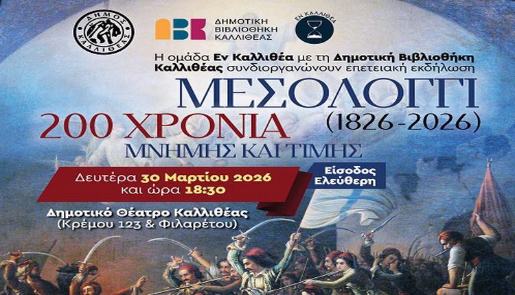 ΔΗΜΟΤΙΚΟ ΘΕΑΤΡΟ ΚΑΛΛΙΘΕΑΣ (Κρέμου 123 & Φιλαρέτου) Δευτέρα 30 Μαρτίου 2026 ΏΡΑ 18.30 «ΜΕΣΟΛΟΓΓΙ 200 ΧΡΟΝΙΑ (1826-2026) ΜΝΗΜΗΣ ΚΑΙ ΤΙΜΗΣ» επετειακή εκδήλωση Η ομάδα Εν Καλλιθέα με τη Δημοτική Βιβλιοθήκη του Δήμου Καλλιθέας συνδιοργανώνουν επετειακή εκδήλωση. ΕΙΣΟΔΟΣ ΕΛΕΥΘΕΡΗ