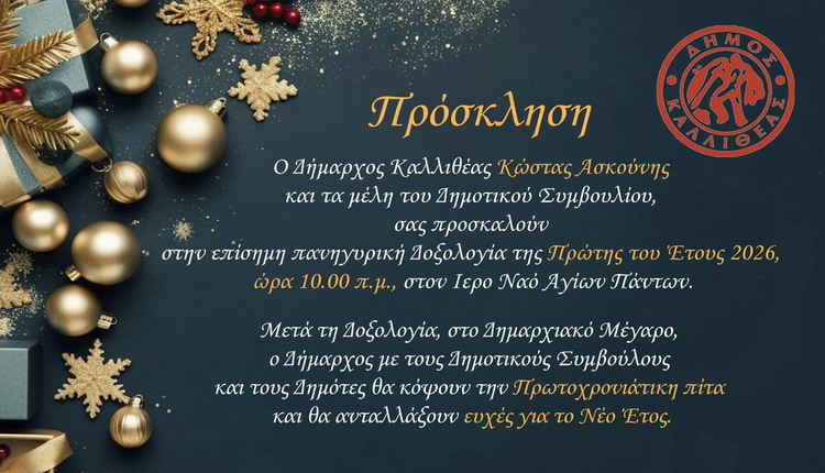 – Πρόσκληση – Ο Δήμαρχος Καλλιθέας Κώστας Ασκούνης και τα μέλη του Δημοτικού Συμβουλίου, σας προσκαλούν στην επίσημη πανηγυρική Δοξολογία της Πρώτης του Έτους 2026, ώρα 10.00 π.μ., στον Ιερό Ναό Αγίων Πάντων. Μετά τη Δοξολογία, στο Δημαρχιακό Μέγαρο, ο Δήμαρχος με τους Δημοτικούς Συμβούλους και τους Δημότες θα κόψουν την Πρωτοχρονιάτικη πίτα και θα […]