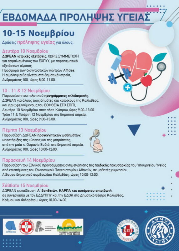 Η εβδομάδα 10-15 Νοεμβρίου είναι αφιερωμένη από τον Δήμο Καλλιθέας στην Υγεία.