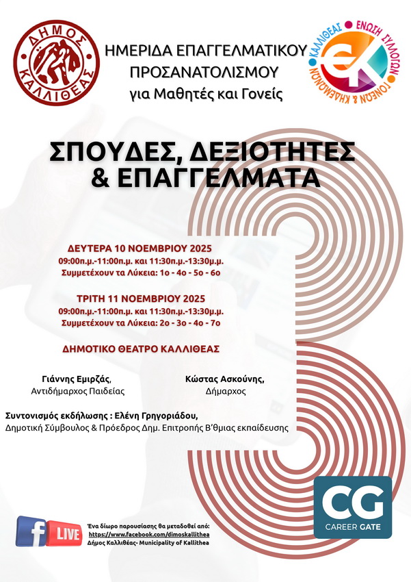 Το Τμήμα Παιδείας & Διά Βίου Μάθησης του Δήμου Καλλιθέας, σε συνεργασία, με την Ένωση Συλλόγων Γονέων & Κηδεμόνων και την Εταιρεία Επαγγελματικού Προσανατολισμού Career Gate, διοργανώνει Ημερίδα Επαγγελματικού Προσανατολισμού για μαθητές και γονείς του Δήμου μας, με στόχο την ενημέρωση για τις σύγχρονες ευκαιρίες επαγγελματικής αποκατάστασης και την καθοδήγηση σχετικά με τις σπουδές και τα