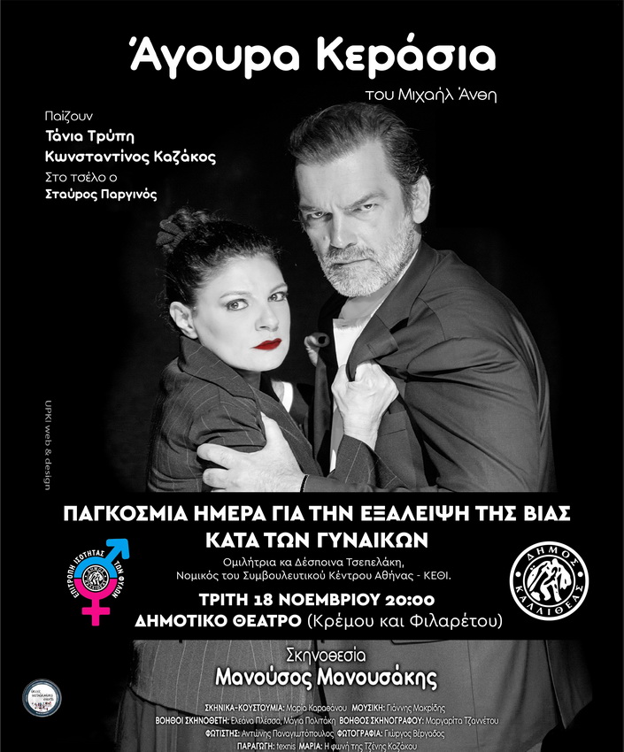 Μετά τις ομιλίες θα ακολουθήσει η θεατρική παράσταση «Άγουρα Κεράσια» με την Τάνια Τρύπη και τον Κωνσταντίνο Καζάκο.