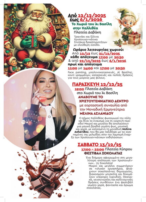 Από 12/12/2025 έως 6/1/2026 Το Χωριό του Άι Βασίλη στην Καλλιθέα – Πλατεία Δαβάκη: τραινάκι και ξύλινα Χριστουγεννιάτικα Σπιτάκια δραστηριοτήτων με ελεύθερη είσοδο.