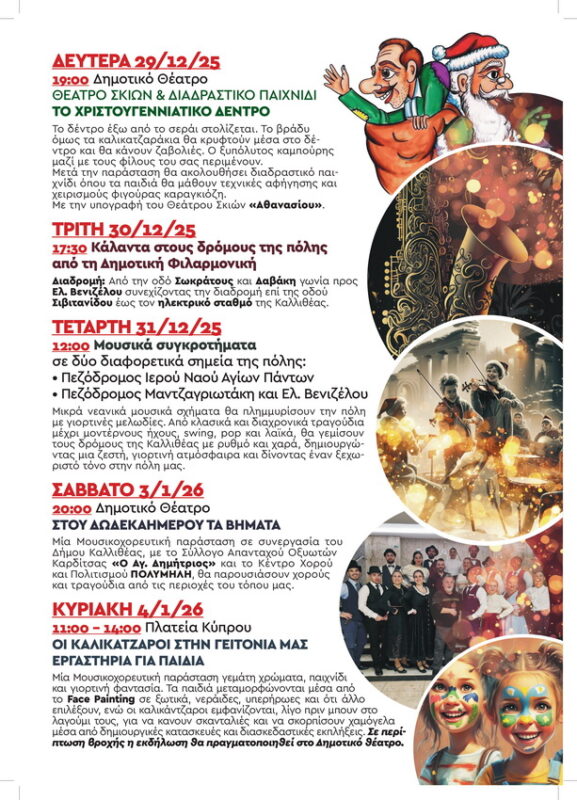& από 22/12/2025 έως 6/1/2026 πρωί και απόγευμα 11:00 με 14:00 και 17:00 με 20:30