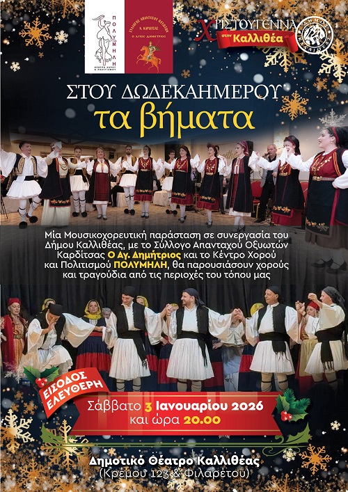 O Σύλλογος Απανταχού Οξυωτών Καρδίτσας «Ο ΑΓΙΟΣ ΔΗΜΗΤΡΙΟΣ» μαζί με το κέντρο χορού και πολιτισμού «ΠΟΛΥΜΗΛΗ», θα παρουσιάσουν χορούς και τραγούδια από τις περιοχές του τόπου μας.