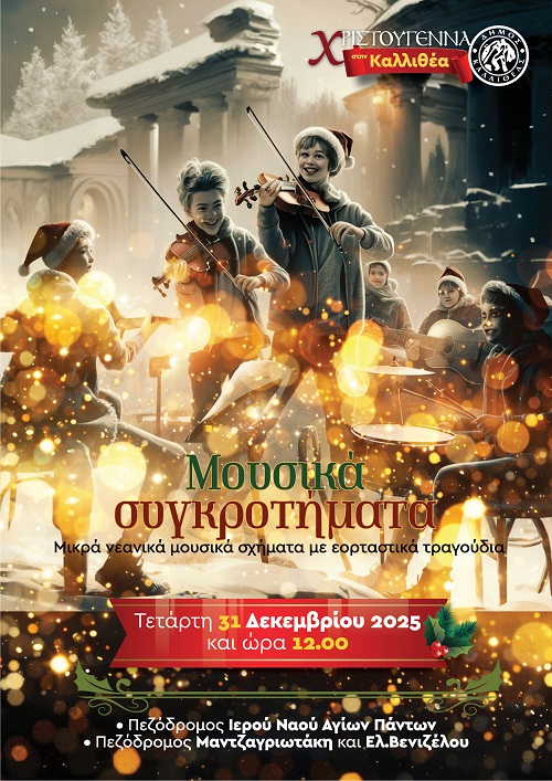 Μικρά νεανικά σχήματα θα πλημμυρίσουν την πόλη με γιορτινές μελωδίες, στον πεζόδρομο του Ι.Ν. ΑΓΙΩΝ ΠΑΝΤΩΝ και στον πεζόδρομο Ματζαγριωτάκη και Ελ. Βενιζέλου