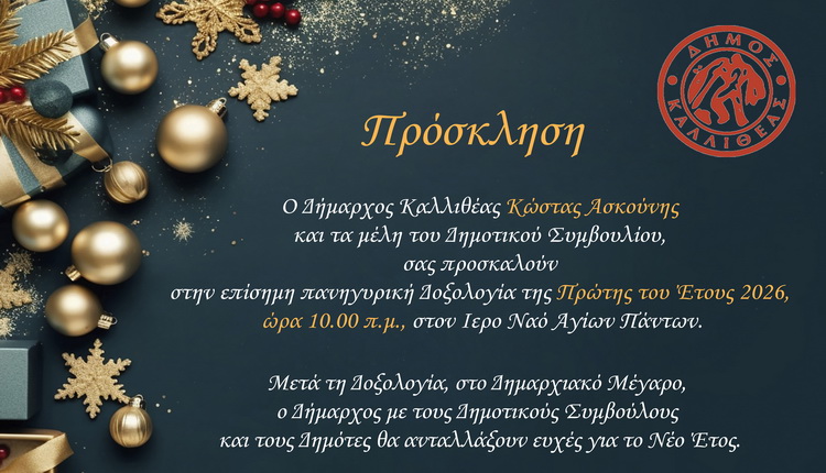 Ο Δήμαρχος Καλλιθέας Κώστας Ασκούνης και τα μέλη του Δημοτικού Συμβουλίου, σας προσκαλούν στην επίσημη πανηγυρική Δοξολογία της Πρώτης του Έτους 2026, ώρα 10.00 π.μ., στον Ιερό Ναό Αγίων Πάντων.