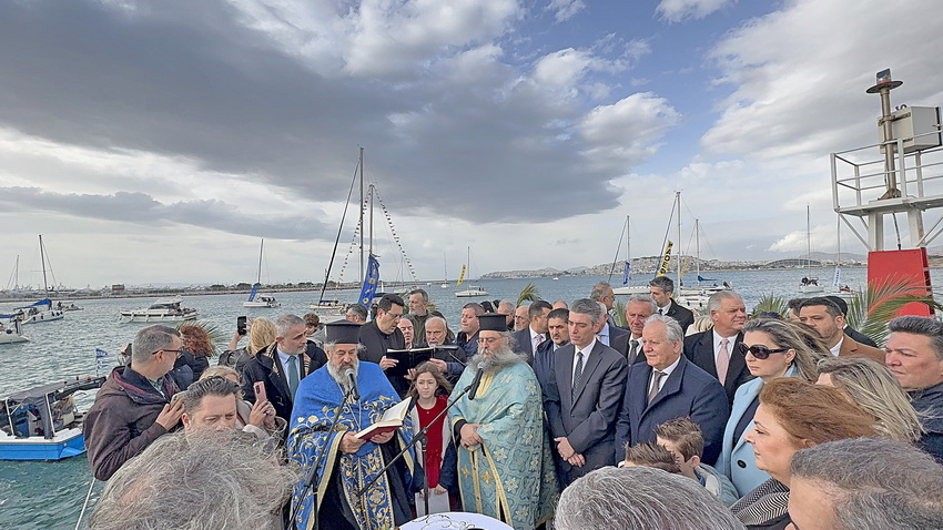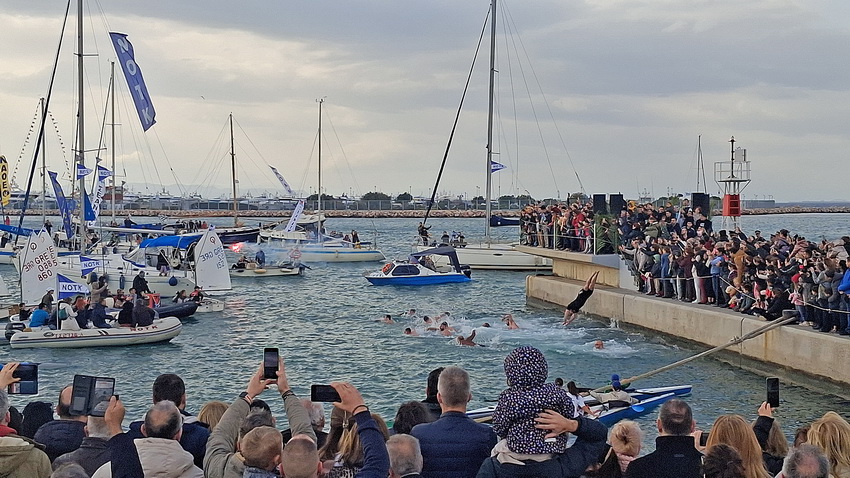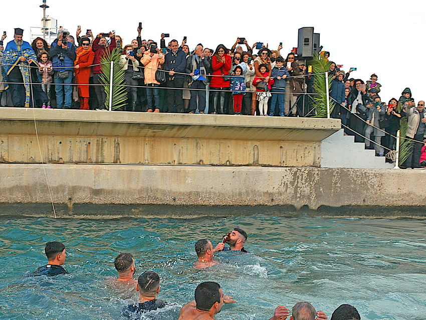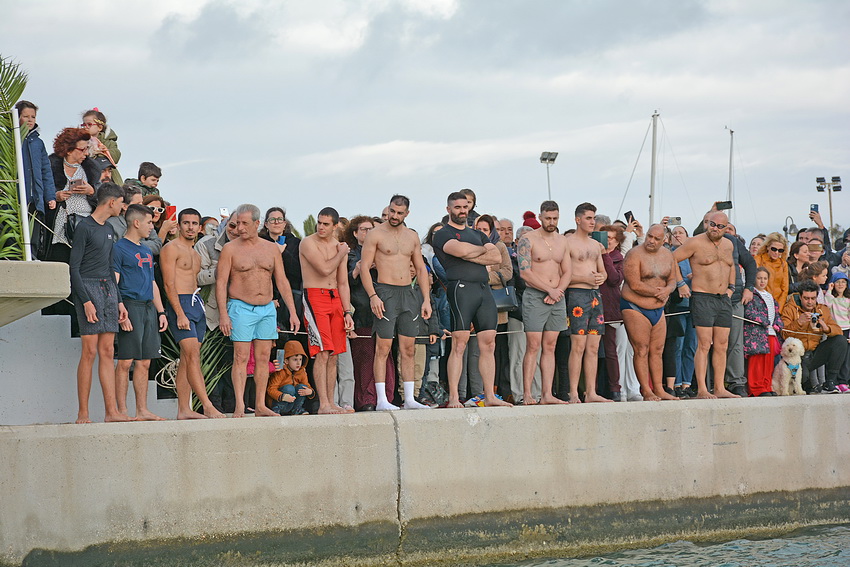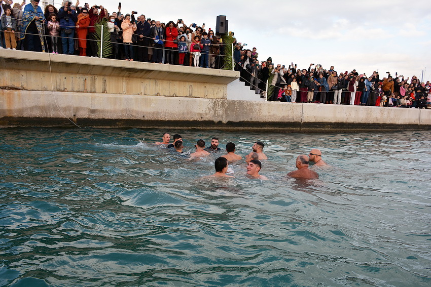 Στην κορύφωση της τελετής, πιστοί κάθε ηλικίας βούτηξαν στα νερά για την ανάσυρση του Τιμίου Σταυρού, όπως προβλέπει το έθιμο.