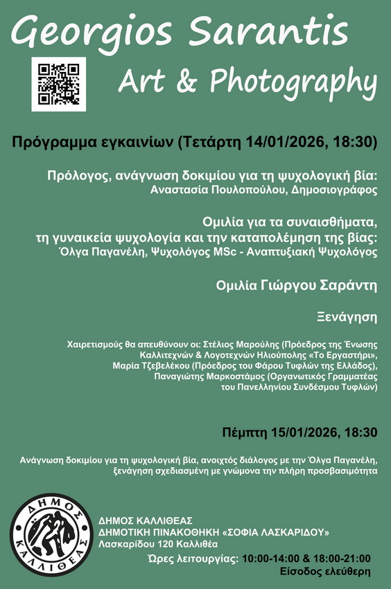 Η Δημοτική Πινακοθήκη Καλλιθέας Σοφία Λασκαρίδου ετοιμάζεται να φιλοξενήσει μια έκθεση που δεν περιορίζεται μόνο στην απλή προβολή έργων, αλλά συνιστά μια ζωντανή, ξεχωριστή εμπειρία και αφήγηση ψυχής. Ο Γιώργος Σαράντης επιστρέφει με την ατομική του έκθεση Συναισθηματολόγιον, που θα πραγματοποιηθεί από τις 12 έως τις 16 Ιανουαρίου 2026 (ώρες λειτουργίας: 10:00-14:00 & 18:00-21:00, είσοδος ελεύθερη).