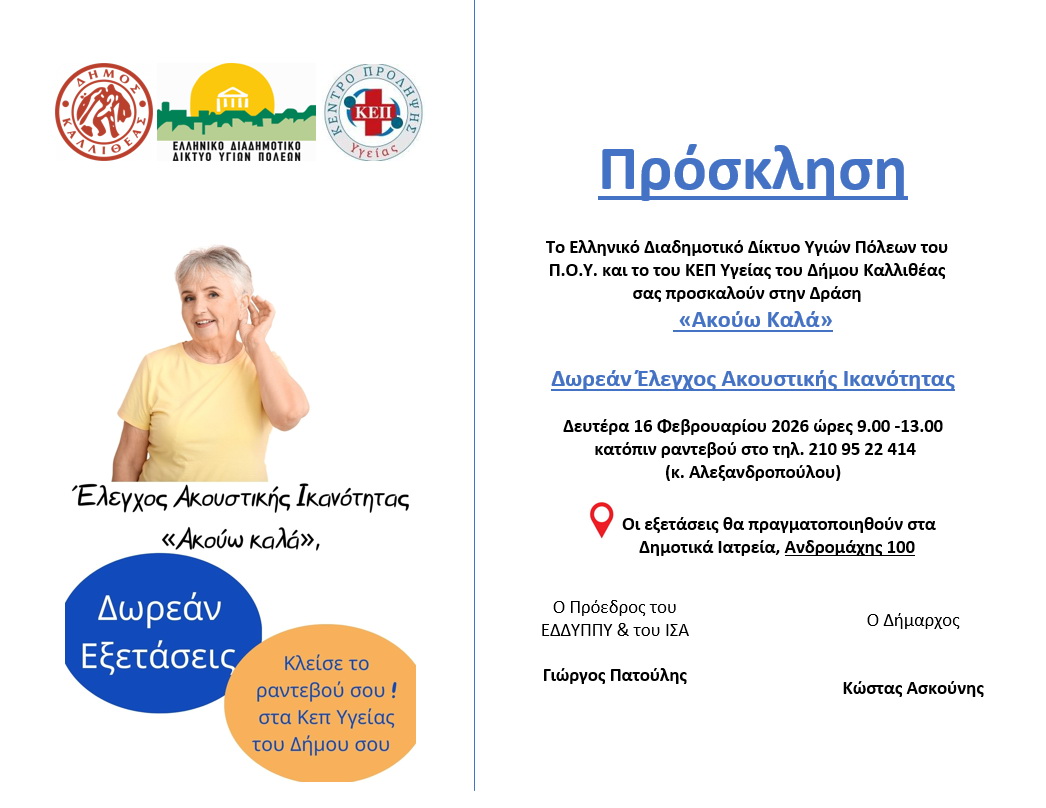 Το Ελληνικό Διαδημοτικό Δίκτυο Υγιών Πόλεων του Π.Ο.Υ., σε συνεργασία με το ΚΕΠ Υγείας Δήμου Καλλιθέας, διοργανώνουν τη δράση προληπτικού ελέγχου ακοής «Ακούω Καλά», προσφέροντας δωρεάν εξετάσεις σε δημότες και κατοίκους.