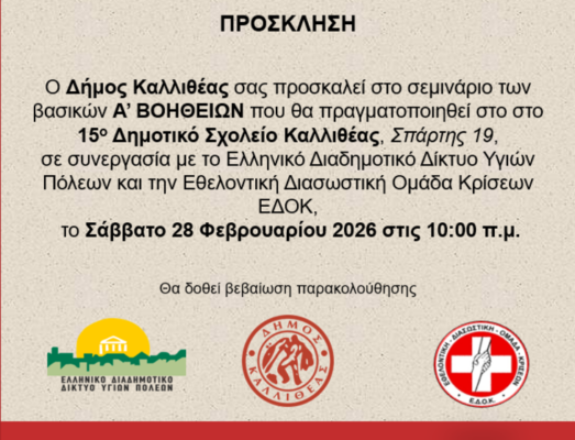 Το Ελληνικό Διαδημοτικό Δίκτυο Υγιών Πόλεων, σε συνεργασία με τον Δήμο Καλλιθέας και τους διασώστες της Εθελοντικής Διασωστικής Ομάδας Κρίσεων ΕΔΟΚ, διοργανώνει το Σάββατο 28 Φεβρουαρίου και ώρα 10:00-14:00,στο 15ο Δημοτικό Σχολείο Καλλιθέας, Σπάρτης 19, το εξαιρετικά χρήσιμο διαδικτυακό σεμινάριο Α’ Βοηθειών «Η γνώση σώζει ζωές».