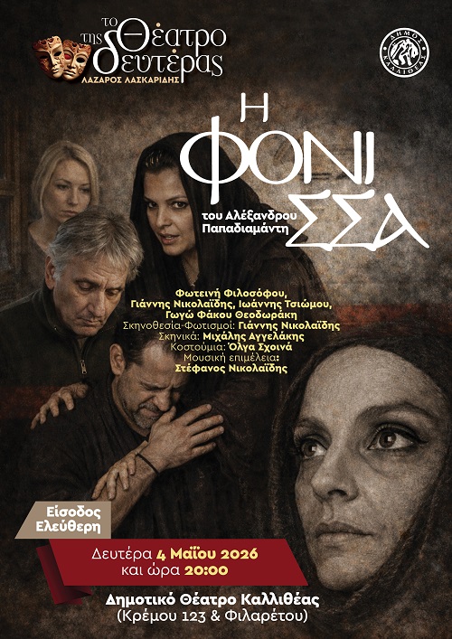 ΔΗΜΟΤΙΚΟ ΘΕΑΤΡΟ ΚΑΛΛΙΘΕΑΣ (Κρέμου 123 & Φιλαρέτου)Δευτέρα 4 Μαΐου 2026ΩΡΑ 20.00 «Η ΦΟΝΙΣΣΑ» θεατρική παράστασητου Αλέξανδρου Παπαδιαμάντη. Σκηνοθεσία –φωτισμοί: Γιάννης Νικολαΐδης
