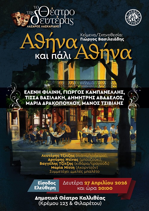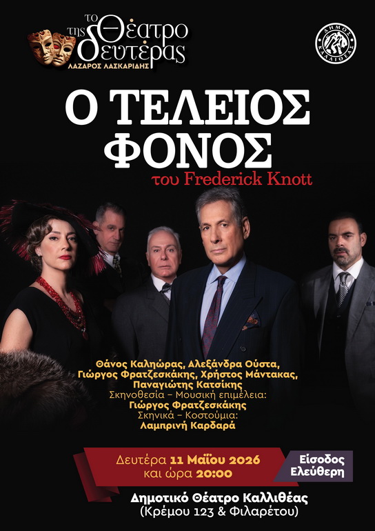 ΔΗΜΟΤΙΚΟ ΘΕΑΤΡΟ ΚΑΛΛΙΘΕΑΣ (Κρέμου 123 & Φιλαρέτου)Δευτέρα 11 Μαΐου 2026ΩΡΑ 20.00 «Ο ΤΕΛΕΙΟΣ ΦΟΝΟΣ» θεατρική παράστασητου Frederick Knott. Σκηνοθεσία – μουσική επιμέλεια:Γιώργου Φρατζεσκάκη